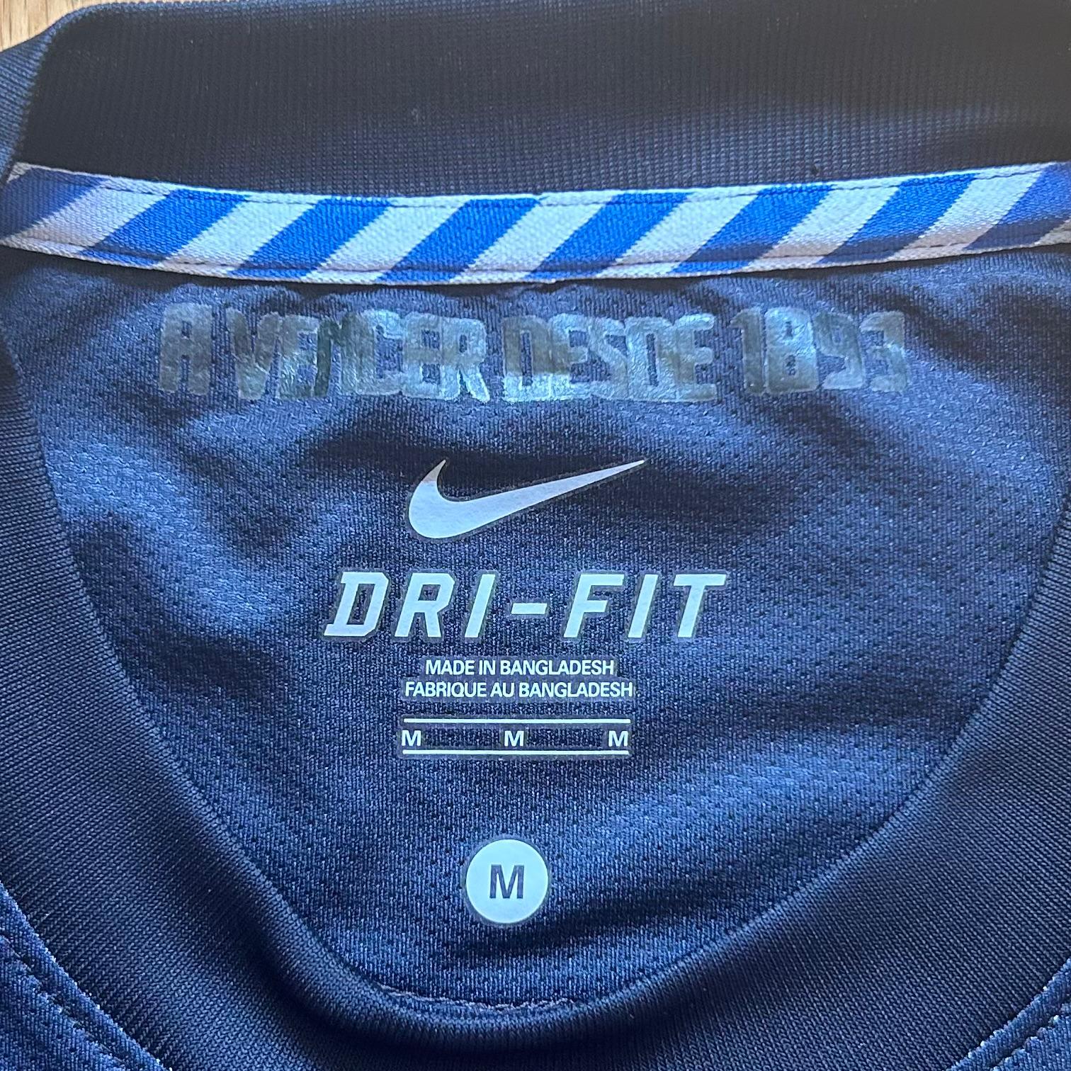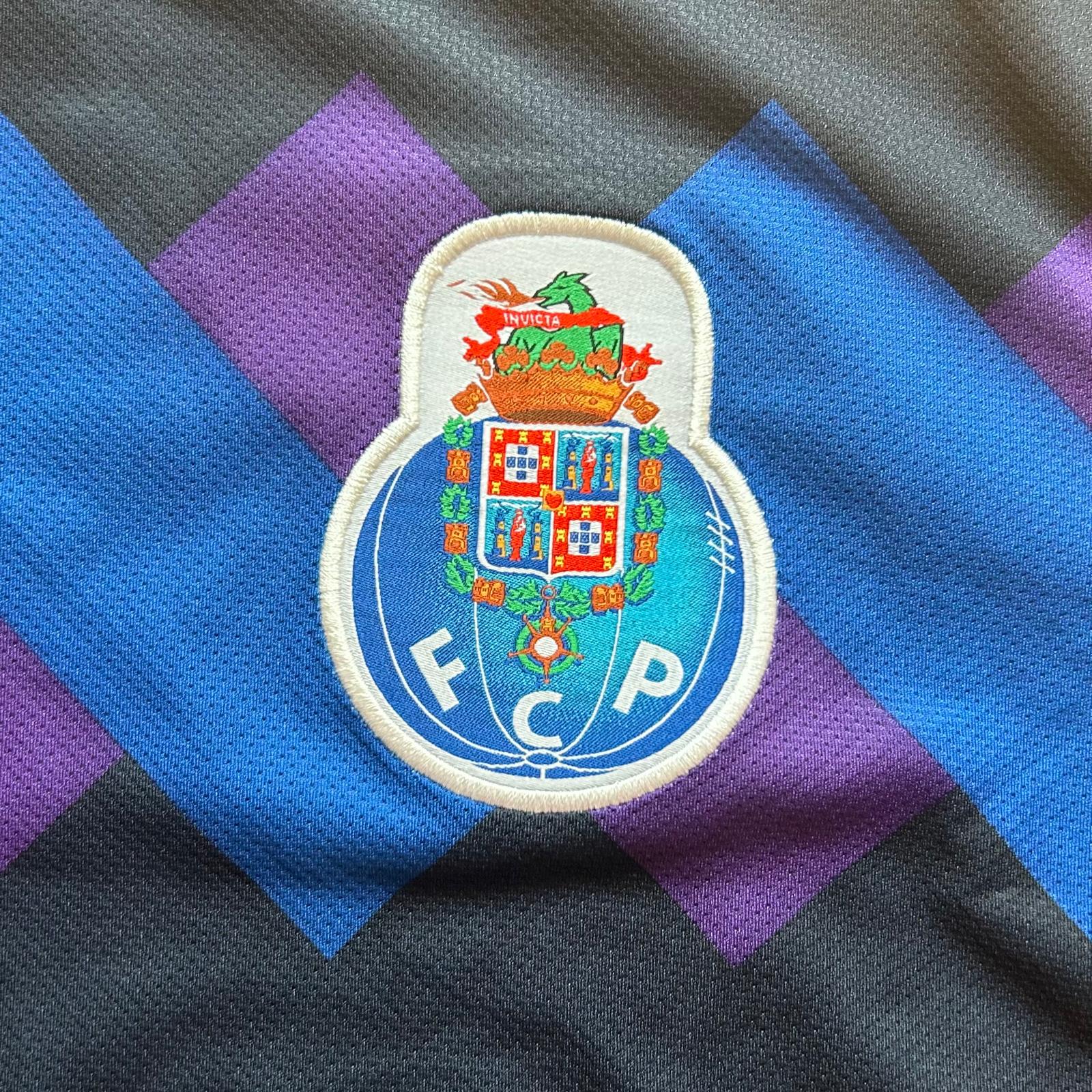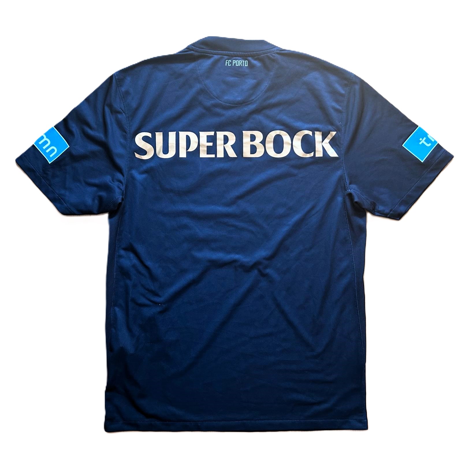 Camiseta de visitante del FC Porto para la temporada 2011 – 2012, diseñada por Nike. Presenta un diseño en tonos oscuros con un patrón geométrico azul en el pecho y el patrocinador MEO al centro. Utilizada en una temporada donde el equipo logró el título de la Primeira Liga.