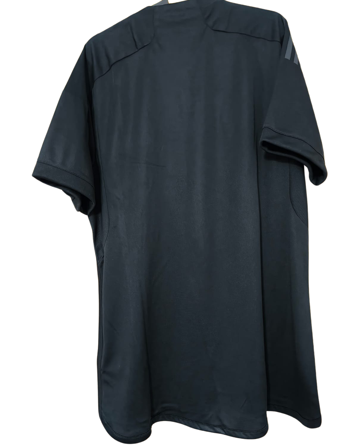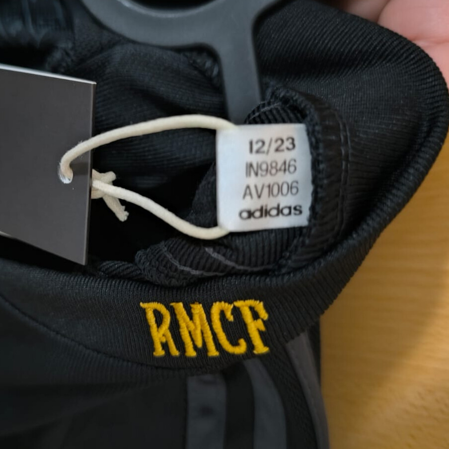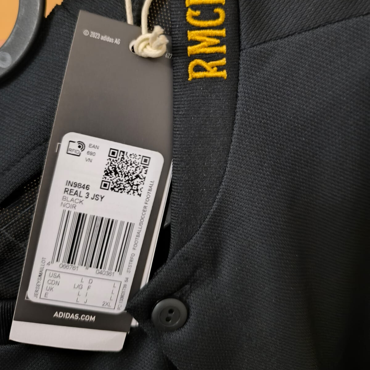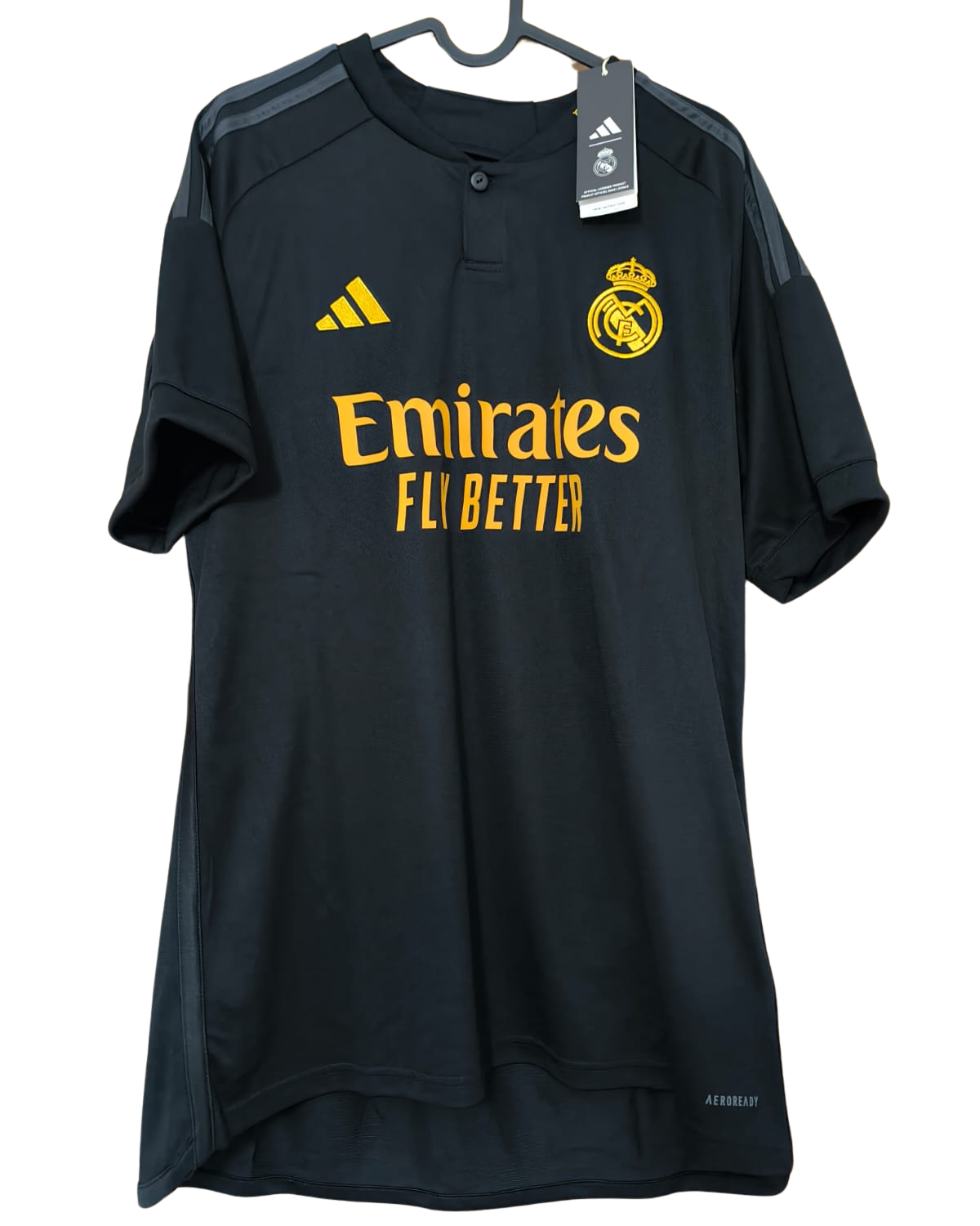 Aquí tenemos la tercera equipación del Real Madrid en la temporada 2023-2024, de color negro con detalles en amarillo dorado. El escudo del club está bordado en el pecho, junto con el logotipo de Adidas y el patrocinador Emirates Fly Better. En esta temporada, el Real Madrid fue campeón de LaLiga y conquistó la Champions League tras vencer al Borussia Dortmund en la final disputada en Londres.