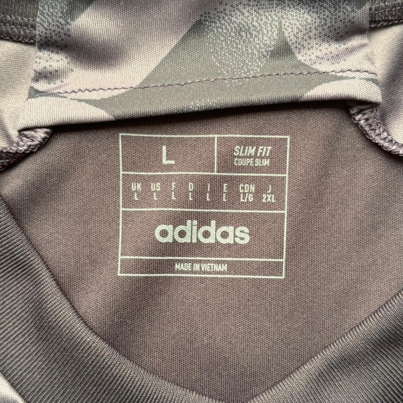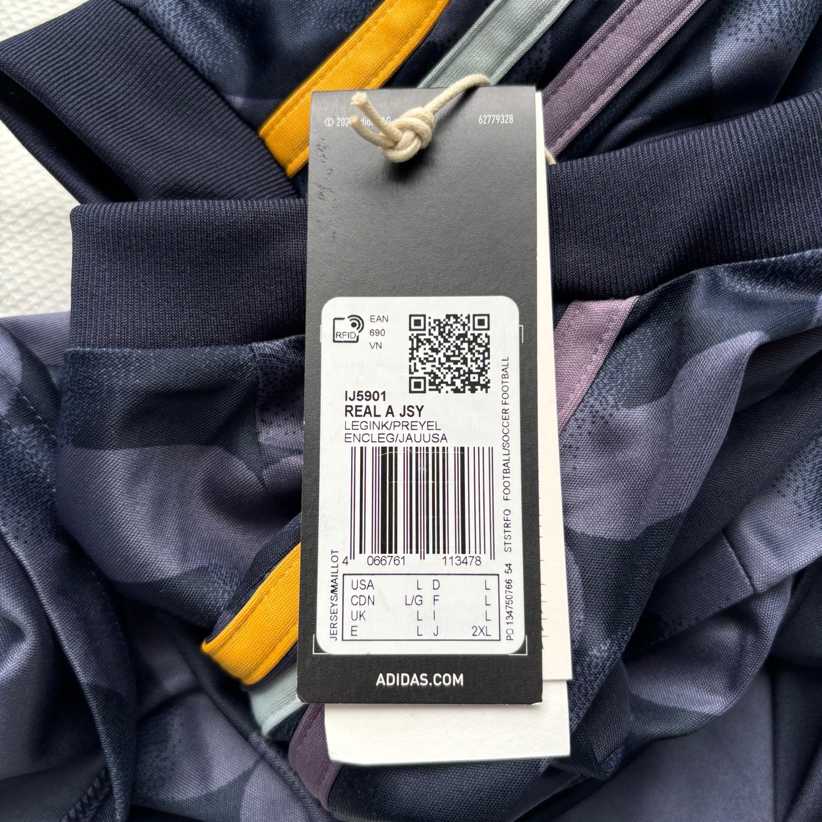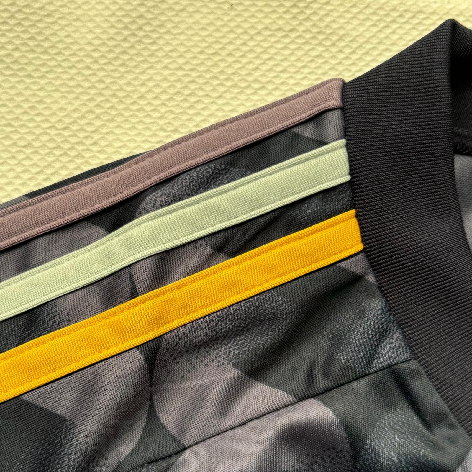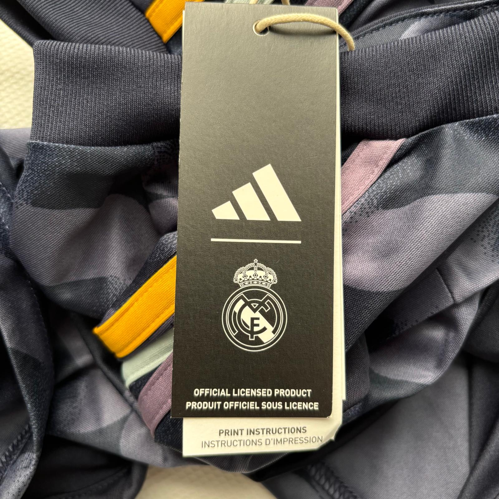 Camiseta visitante del Real Madrid en la temporada 2023-2024, de color negro con un patrón ondulado en el tejido y detalles en dorado. Fabricada por Adidas, presenta el escudo bordado en el pecho, el patrocinador Emirates Fly Better en blanco y las icónicas tres franjas en los hombros.