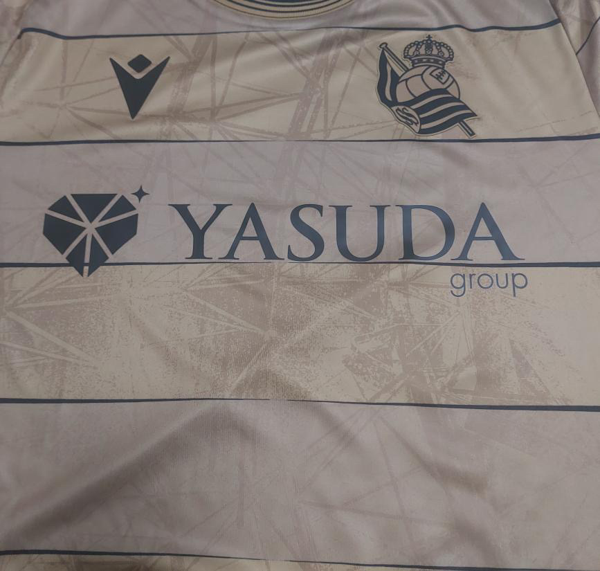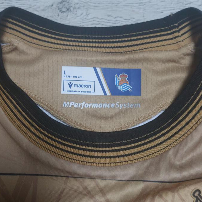 La Real Sociedad presentó esta camiseta visitante para la temporada 2024–25, fabricada por Macron. El diseño, en un tono dorado con detalles en negro y gráficos representando su estadio, ofrece una estética elegante y moderna. El club donostiarra llegó a octavos de final de la Europa League y hasta semifinales de la Copa del Rey.