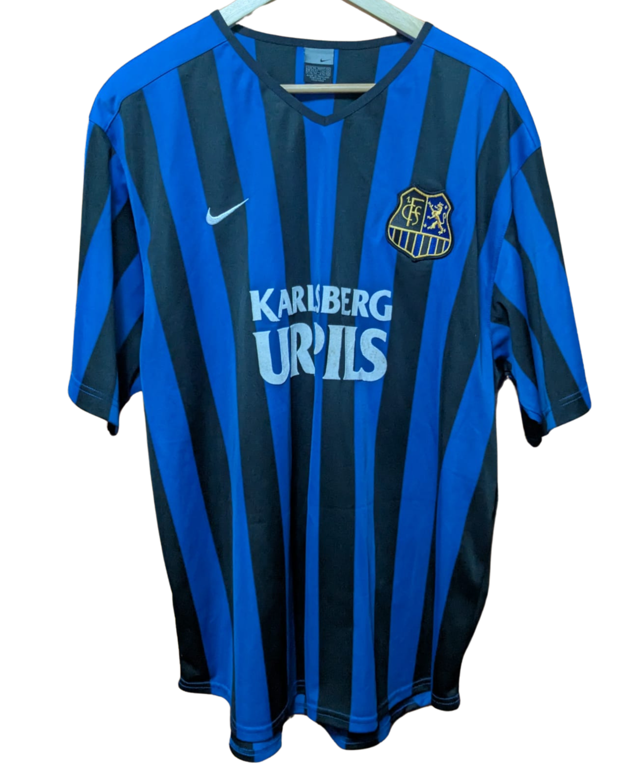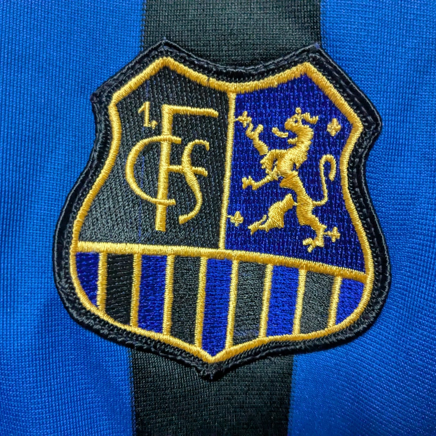 Camiseta local del 1. FC Saarbrücken utilizada entre las temporadas 2002–2005, fabricada por Nike. Presenta las tradicionales franjas verticales en azul y negro. Durante este periodo, el club compitió mayormente en la Regionalliga Süd (tercera división alemana) y logró el ascenso a la 2. Bundesliga al finalizar campeón en la temporada 2003–2004. En la DFB-Pokal (Copa de Alemania) tuvo participaciones discretas, sin alcanzar rondas avanzadas.