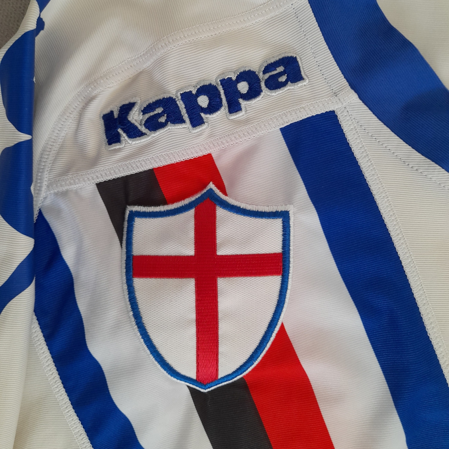 La camiseta de la segunda equipación (visitante) de la Sampdoria de las temporadas 2010-2011 y 2011-2012, de la marca Kappa, es de manga larga y presenta un diseño blanco con la banda blucerchiata diagonal. En la temporada 2010-2011, el equipo descendió a la Serie B al finalizar 18º en la Serie A y llegó a cuartos de final de la Coppa Italia. En la 2011-2012, ascendió de nuevo a la Serie A tras quedar 6º en Serie B y alcanzar los playoffs, siendo eliminado en la 3ª ronda de la Coppa Italia.