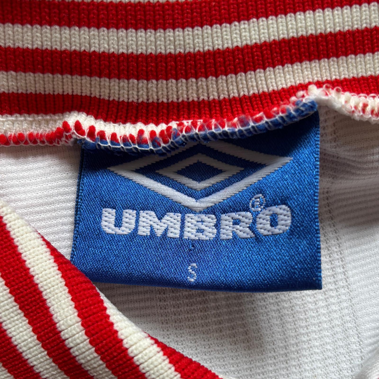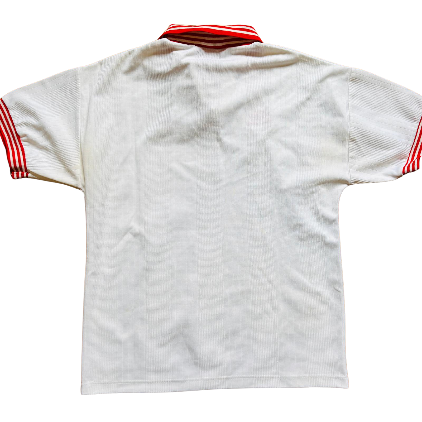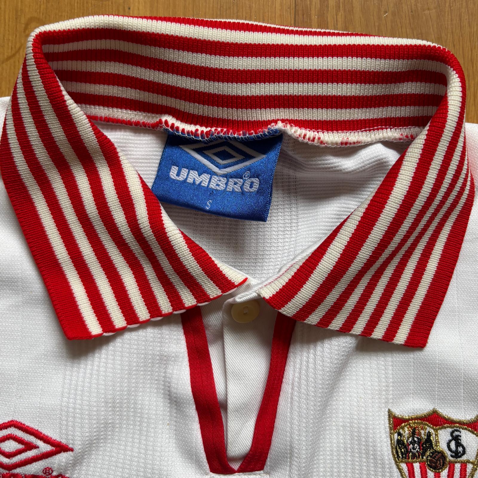 La camiseta local del Sevilla FC, de Umbro, utilizada de 1996 a 1998, es blanca con cuello polo y puños a rayas rojas y blancas. En la temporada 1996-1997, el equipo quedó 20º en LaLiga en una mala temporada y descendió a Segunda División. En la temporada 1997-1998, el equipo acabó 7º en Segunda División.