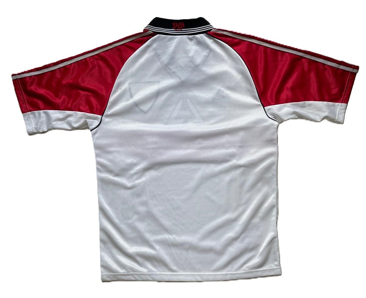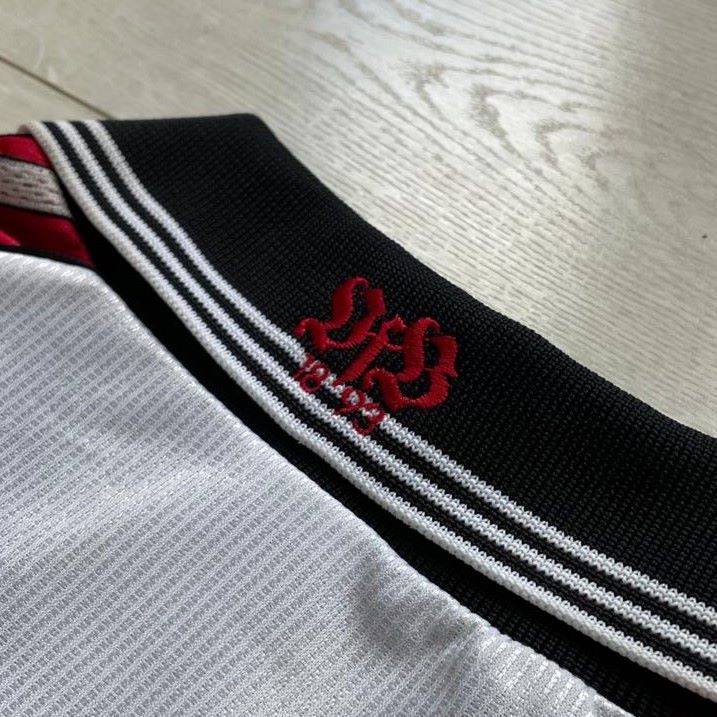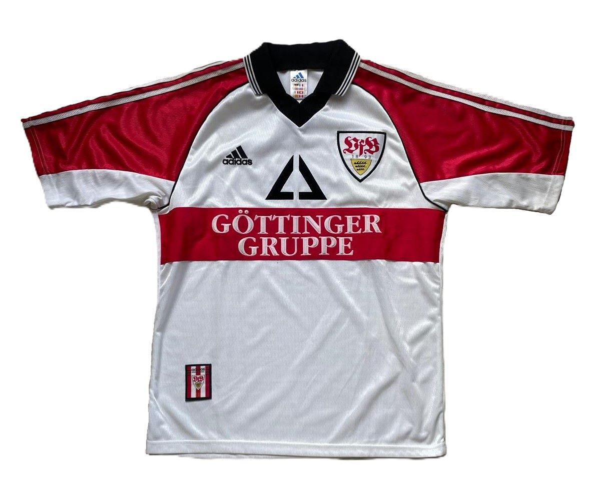 La camiseta local del VfB Stuttgart para la temporada 1998-1999, fabricada por Adidas, mantiene el diseño tradicional del club con una franja roja horizontal sobre fondo blanco. El escudo del Stuttgart aparece en el pecho, acompañado del patrocinador Göttinger Gruppe y el logo de Adidas. En esta temporada, el equipo disputó la Bundesliga y la Copa de la UEFA, además de la DFB-Pokal. Finalizó en la mitad de la tabla en liga, alcanzó los cuartos de la Copa mientras que en Europa llegó hasta los dieciseisavos de final.