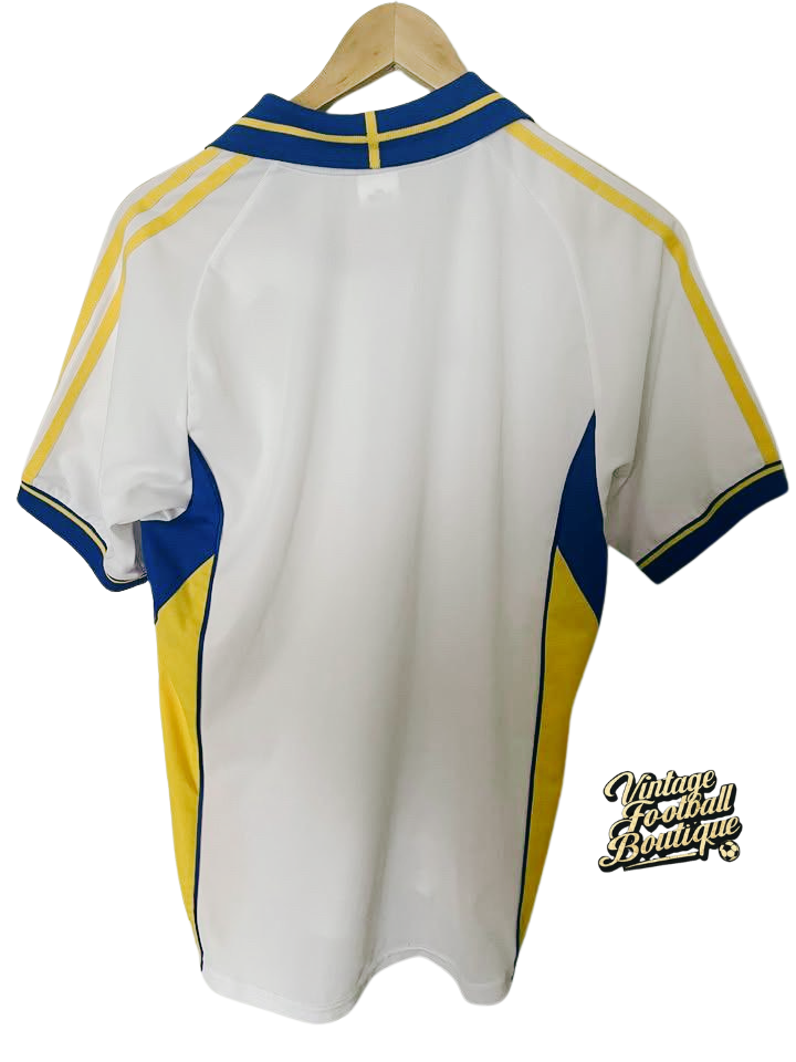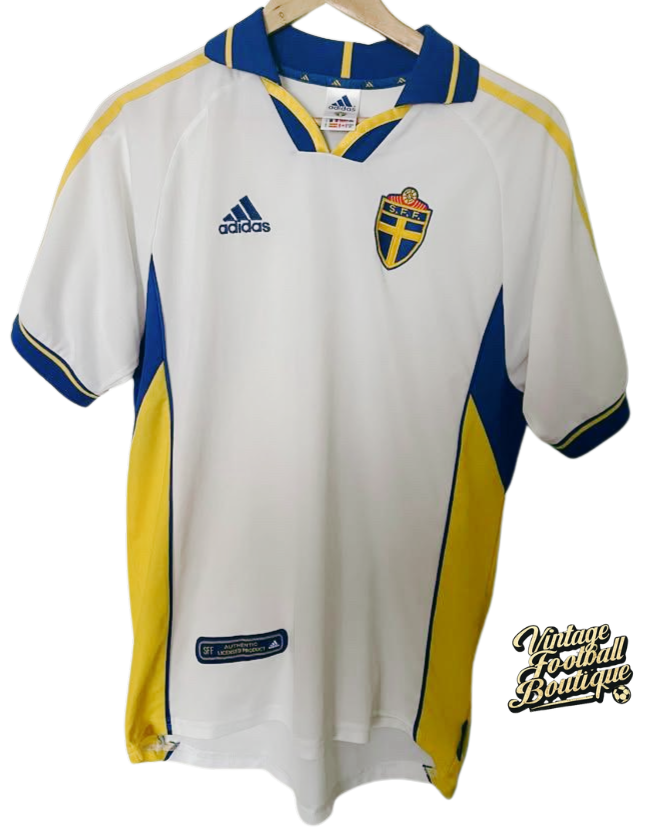 La camiseta visitante de Suecia entre 2000 y 2002 presenta un diseño en blanco con detalles en azul y amarillo en los costados y mangas. Aunque Suecia participó en la Eurocopa de ese año, no llegó a vestirla en el campeonato. Fue utilizada en la fase de clasificación para el Mundial 2002, en la que Suecia terminó primera de grupo, por delante de Inglaterra.