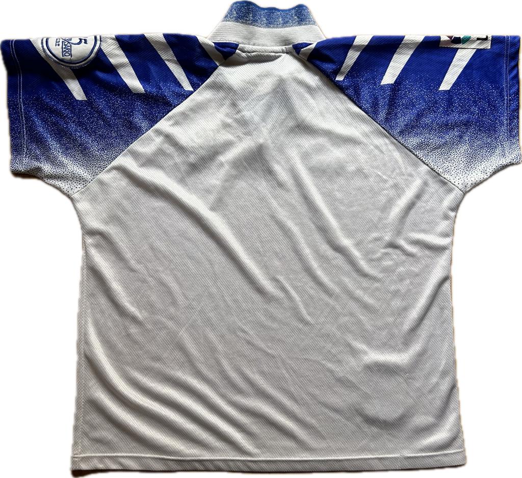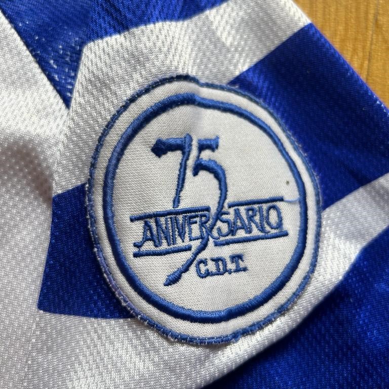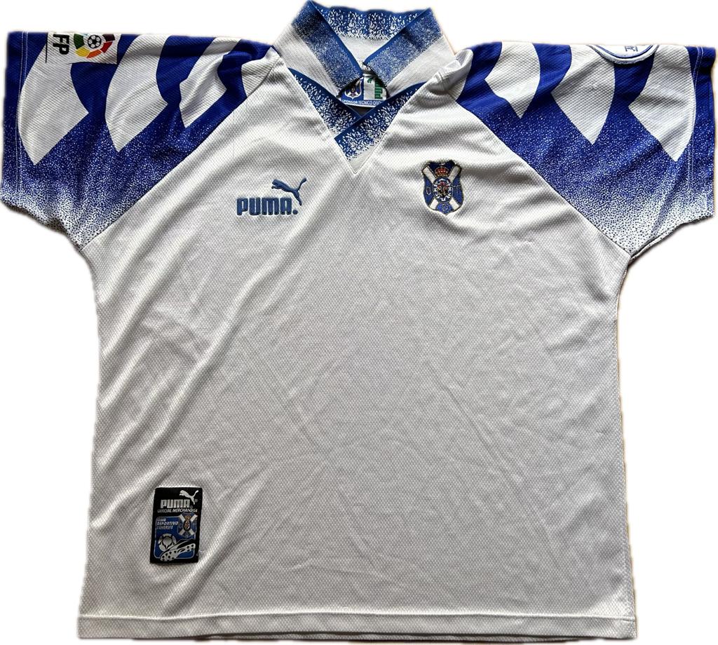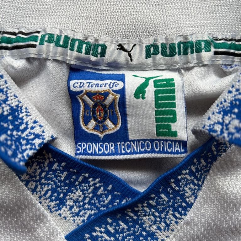 La camiseta local del CD Tenerife para la temporada 1997-1998, diseñada por Puma, es un distintivo ejemplo del estilo noventero. Su base blanca con detalles en azul en forma de picos degradados en los hombros la convierte en una pieza fácilmente reconocible. Durante esa campaña, el Tenerife compitió en LaLiga acabando 16º, manteniendo su estatus en Primera División en una etapa significativa para el club. Esta camiseta lleva un parche en la manga izquierda para conmemorar el 75 aniversario del club.