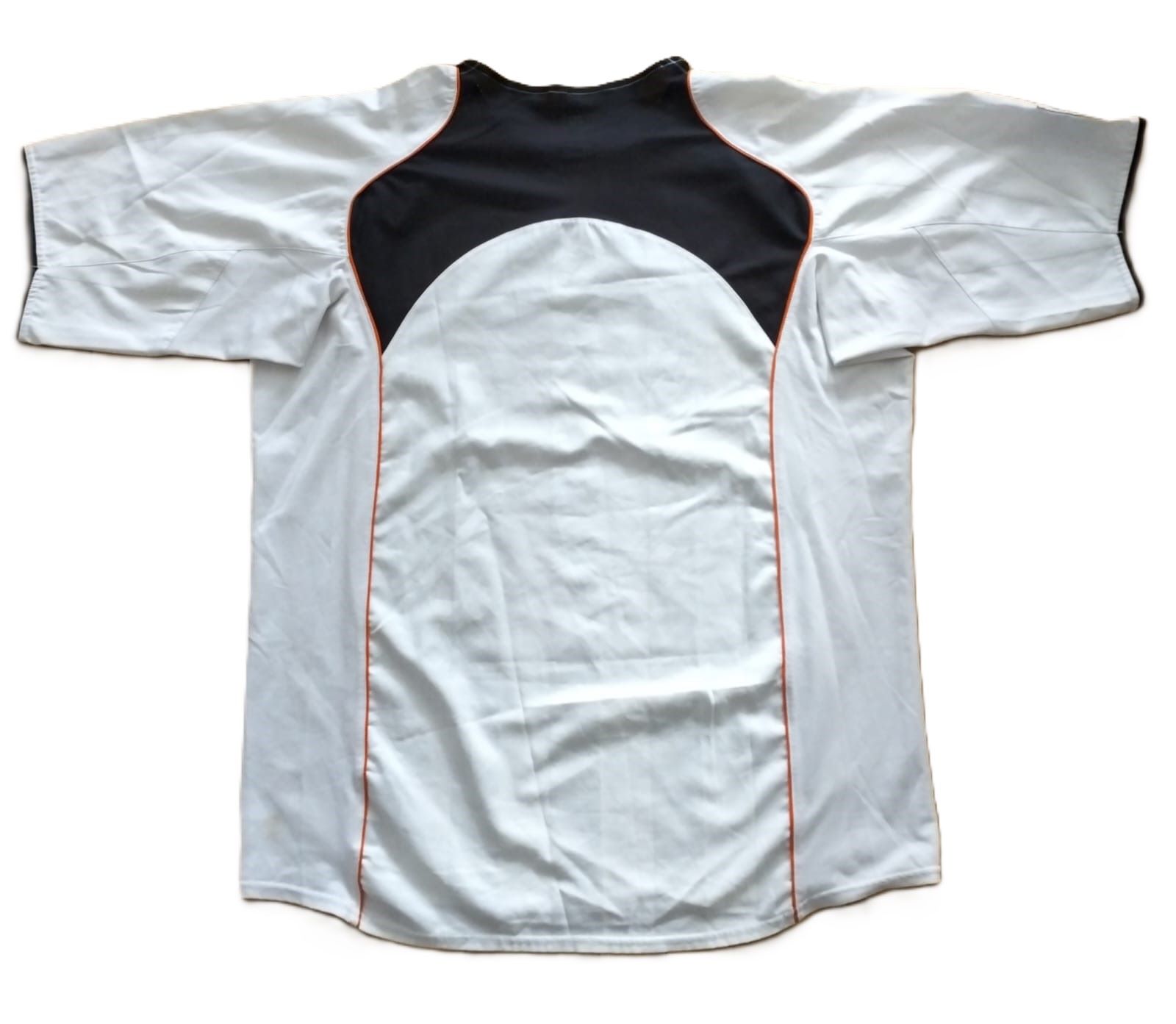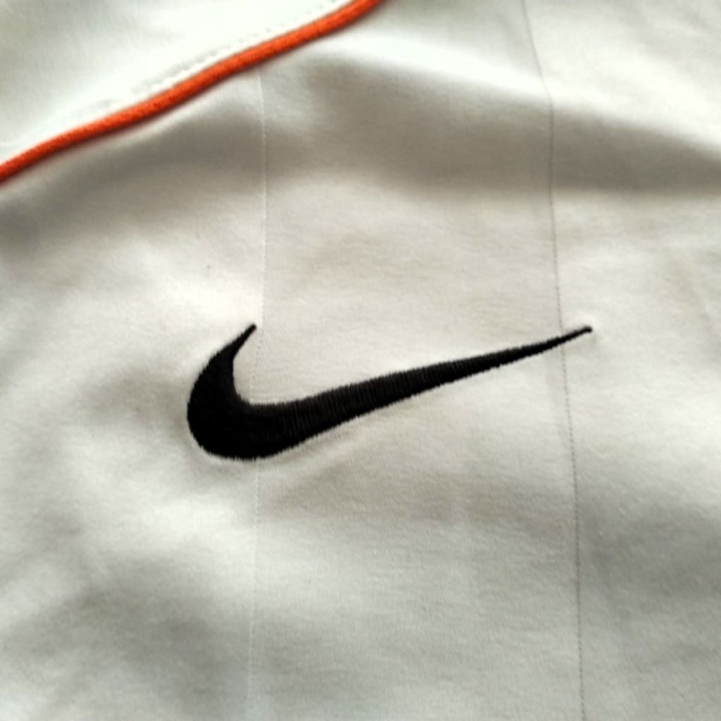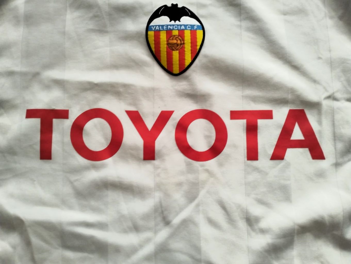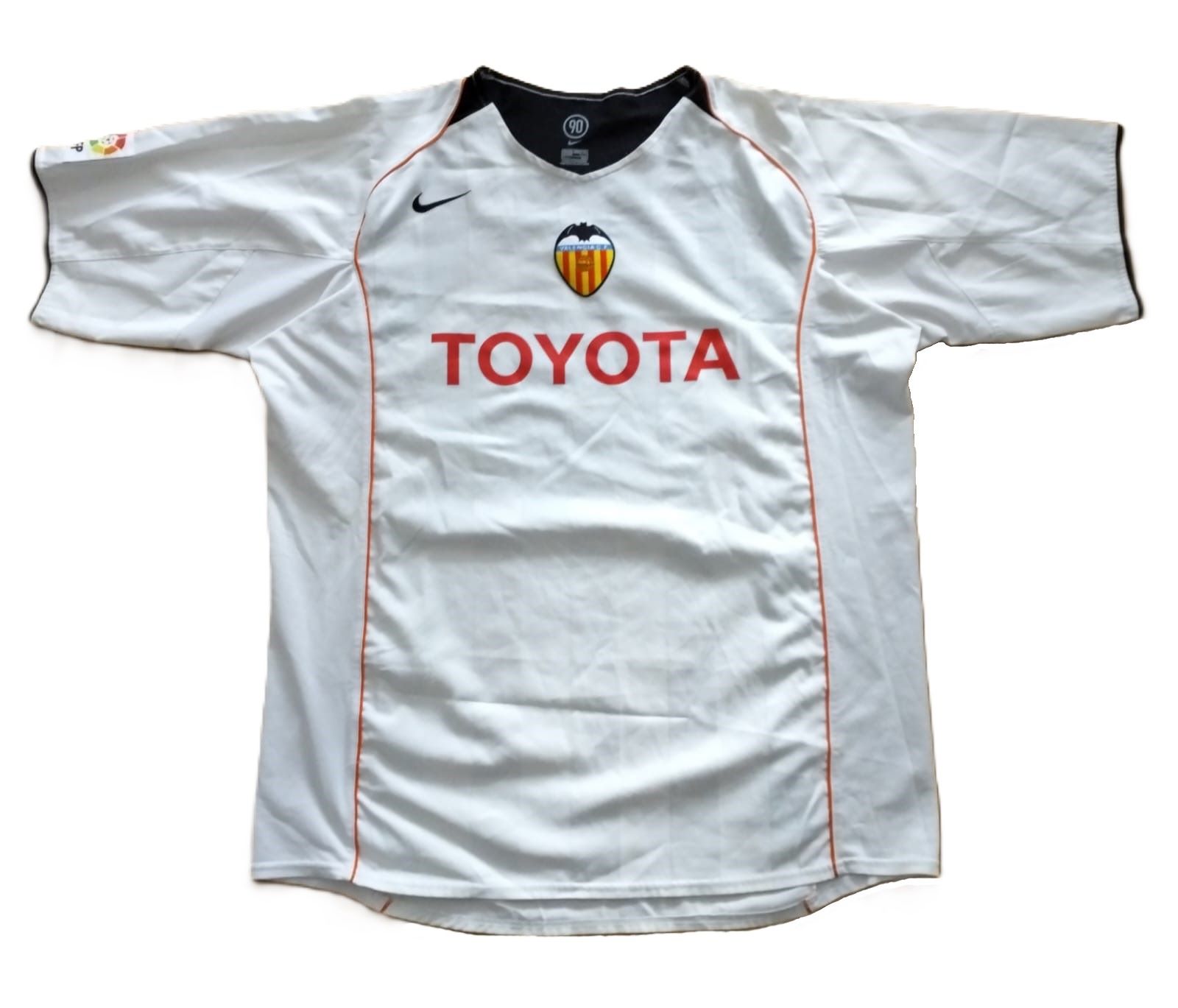 Camiseta local del Valencia CF para la temporada 2004-2005, fabricada por Nike dentro de su icónica línea Total 90. Diseño en blanco con detalles en negro y naranja, escudo del club en el pecho y patrocinador Toyota en el centro. La temporada 04/05 empezó bien al ganar la Supercopa de Europa ante el Porto, pero al final fue un fiasco: 7º en Liga, eliminado en fase de grupos de Champions y en el primer cruce de UEFA, y también en primera ronda de Copa del Rey.