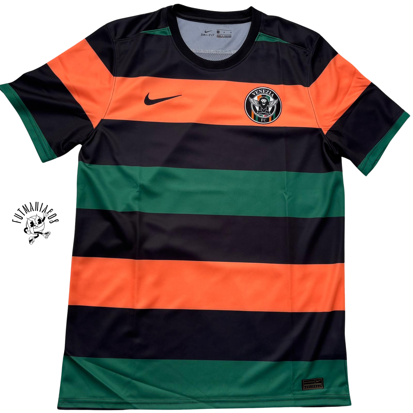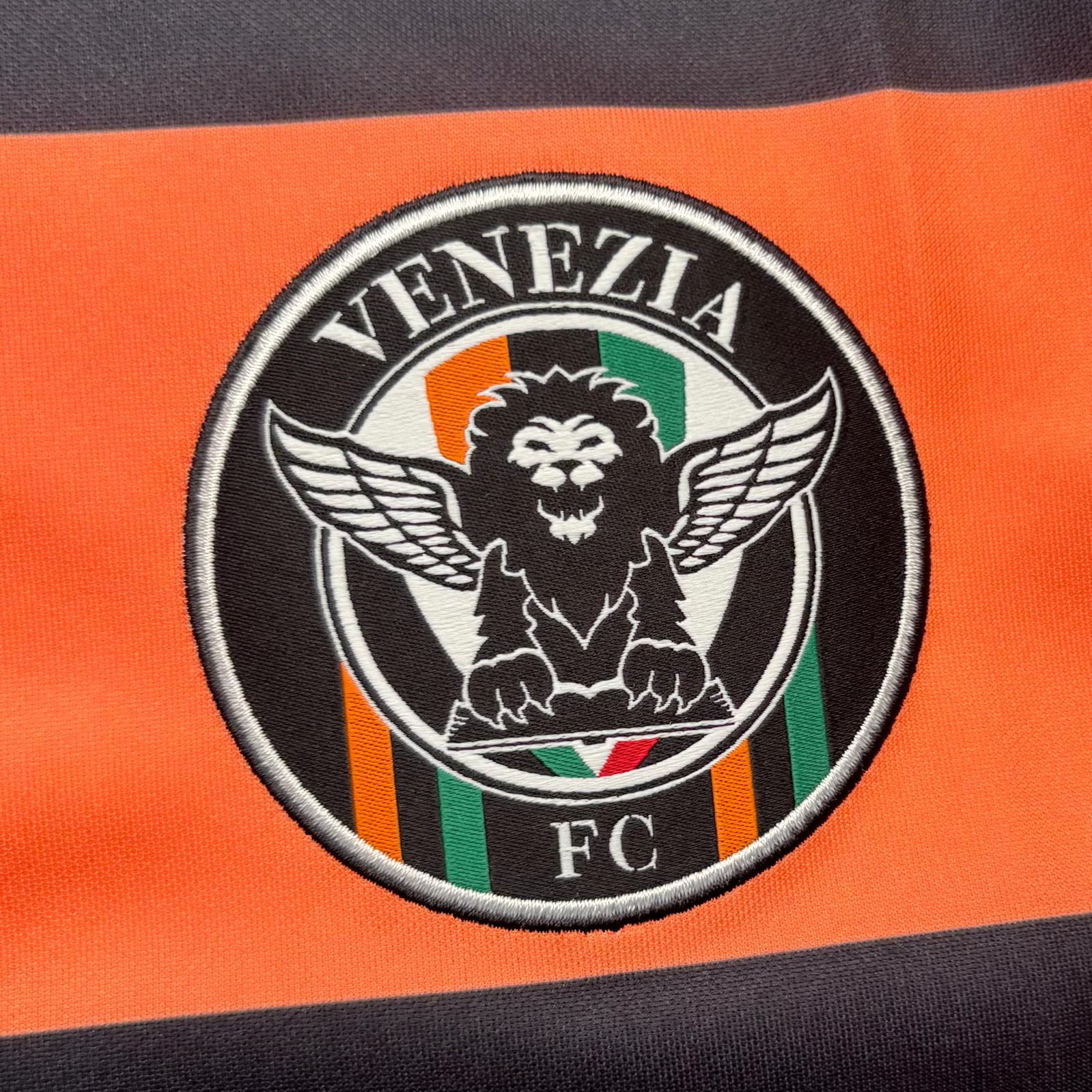El Venezia FC utilizó esta camiseta local en la temporada 2020-21, diseñada por Nike. Con un diseño a franjas horizontales en negro, verde y naranja, esta equipación fue una de las más llamativas del club en los últimos años. El equipo compitió en la Serie B, logrando el ascenso a la Serie A tras una gran campaña y una destacada actuación en los play-offs de ascenso, donde eliminó al Lecce en semifinales y venció al Cittadella en la final.