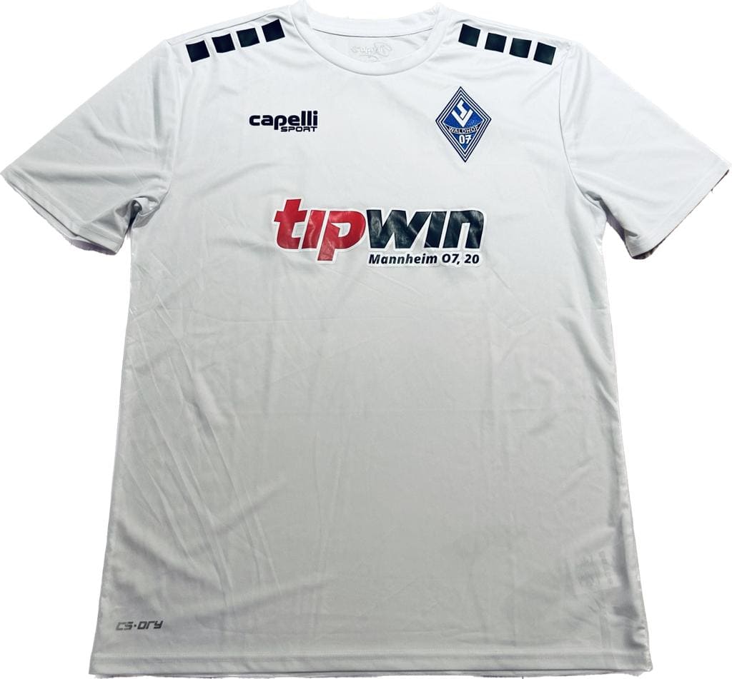 La camiseta visitante del Waldhof Mannheim para la temporada 2018-2019, fabricada por Capelli Sport, presenta un diseño sencillo y funcional en color blanco con detalles en negro. Este modelo fue utilizado por el equipo alemán durante su participación en la Regionalliga Südwest, una campaña en la que lograron el ascenso a la 3. Liga, el tercer nivel del fútbol alemán. El diseño destaca por su simplicidad: una base blanca lisa, con el logo de Capelli Sport en negro en el pecho derecho, mientras que en el izquierdo se encuentra el escudo del club. El patrocinador principal, Tipwin, aparece en el centro con su distintivo diseño en rojo y negro, acompañado del texto «Mannheim 07, 20» que hace referencia a la sede de la empresa.