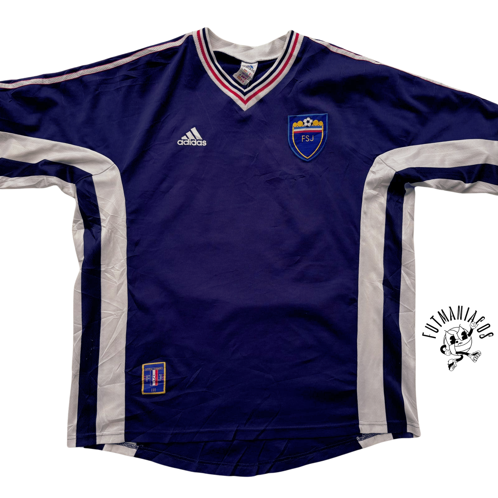 Camiseta local de la selección de Yugoslavia para el Mundial de Francia 1998, diseñada por Adidas. Con un diseño azul con detalles en blanco y rojo, la selección yugoslava alcanzó los octavos de final en su última participación en una Copa del Mundo antes de su disolución.